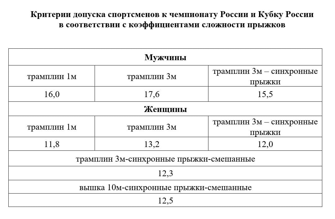 Критерии допуска спортсменов к ЧЕМПИОНАТУ и КУБКУ России в соответствии с коэффициентами сложности прыжков